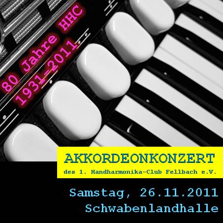 Mit einem tollen Akkordeonkonzert feierte der HHC am 26.11.2011 sein 80-jähriges Vereinsjubiläum. Im gut gefüllten Hölderlinssal der Schwabenlandhalle Fellbach eröffnete das Hobbyorchester mit "Concerto d'amore" und "Cat Stevens in Concert" das Konzert. Anschließend gab das Schülerorchester mit "Rocking Kids" seine Konzertpremiere mit einem eigenen Musikstück. Bevor "I Cinque Musici" ihre Fingerfertigkeit in "Asturias" und "Verano Porteno" erneut unter Beweis stellten, wurden vom 1. Vorsitzenden Christof Neudek langjährige Ehrungen durchgeführt.