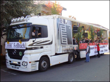Fast schon traditionell (nämlich schon zum zweiten mal!) waren wir unübersehbar dabei - beim Festumzug des Fellbacher Herbst. Wie schon im letzten Jahr begeisterten die Spielerinnen und Spieler auf einem LKW mit Auflieger die zahlreichen Zuschauer und Zuhörer. Bei strahlend sonnigem Herbstwetter heizten wir den Leuten mit "Rock arround the clock" und "Swingin Safari" richtig ein.