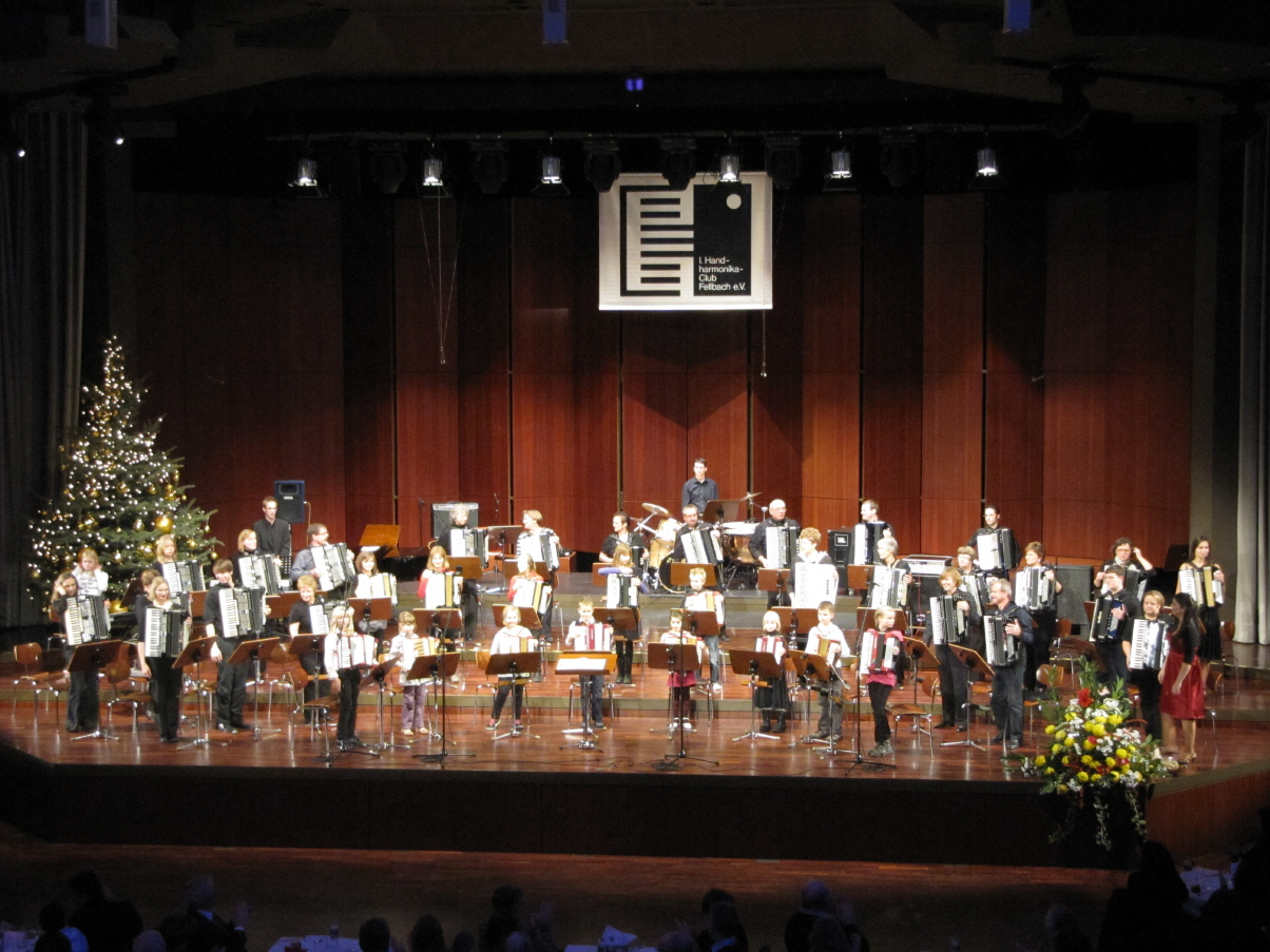 Mit Pop & Rock von Boney M., den Beatles und von ABBA eröffnete das Hobbyorchester das diesjährige Akkordeonkonzert am 5. Dezember 2009 in der Schwabenlandhalle. Das Publikum im vollbesetzten Hölderlinsaal war begeistert von den bekannten Medleys. Anschließend glänzte das Ensemble "I Cinque Musici" mit dem "Girl of Ipanema" und anderen schwierigen Stücken, wo die SpielerInnen ihre Fingerfertigkeit gekonnt unter Beweis stellten. Dasselbe tat Patrick Brunner, der Enkel unseres Ehrendirigenten Karl-Heinz Hagmaier, der als Solist einen glanzvollen Auftritt hatte.