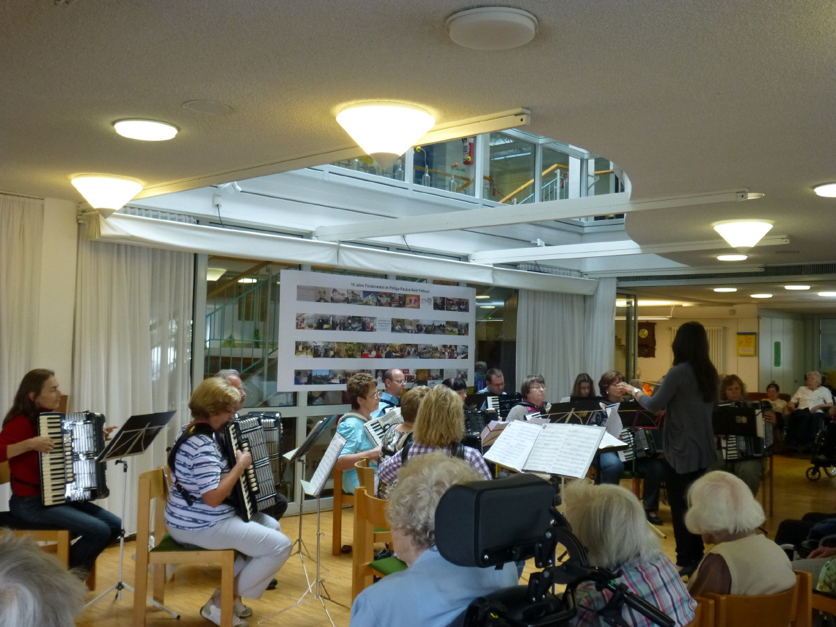 Nach dem alljährlichen Auftritt des Hobbyorchesters im "Haus am Kappelberg" war es für die SpielerInnen des 1. Orchester das erste mal, dass Sie in einem Pflegeheim in Fellbach auftraten. Am 15.07.2012 gestalten der HHC das diesjährige Sommerkonzert des Heims, das witterungsbedingt leider im Haus stattfinden musste. Die zahlreichen Heimbewohner waren begeistert von den vielen bekannten Melodien, die Carmela Totaro für den Auftritt zusammengestellt hatte.