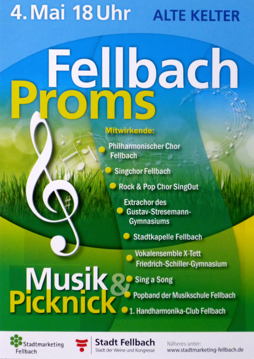Auch bei den 2. Fellbach Proms war der HHC mit seinem 1. Orchester dabei. Zusammen mit der Stadtkapelle, dem Kinderchor des PCF, dem Philharmonischen Chor, Sing A Song, SingOut, dem Extrachor des GSG, dem X-tett des FSG, dem Singchor und der Popband der Musikschule hat der HHC das Promenadenkonzert gestaltet. Dem Publikum haben wir uns mit "Music" und "Africa" in diesem Jahr poppig präsentiert und uns von den zahlreichen Chören deutlich abgehoben. Zum großen Finale sangen und spielten alle Musiker gemeinsam die Europahymne "Freude schöner Götterfunken" von Ludwig van Beethoven.