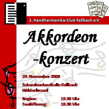 Das traditionelle Akkordeonkonzert fand am 29. November 2008 statt. Nach dem "Event-Highlight" mit dem diesjährigen Filmmusikkonzert galt es, musikalisch das "i-Tüpfelchen" darauf zu setzen. Die Folge war ein abwechslungsreiches und anspruchsvolles Programm, das vom Publikum begeistert bejubelt wurde: